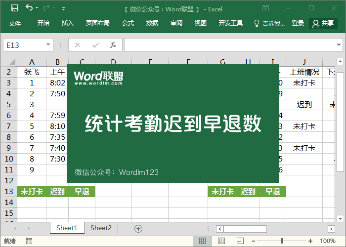 楼主(阅:12527/回:0)HR必须掌握的函数 快速计算迟到、早退、未打卡统计考勤对于公司的HR人力资源来说,每月月底都要统计公司人员的考勤情况,比如谁迟到了,谁早退了等等。当然,在统计的过程中我们肯定是要借助一些函数公式来协助我们快速而又准确的获取结果。在这里小汪老师就来给大家分享几个常用公式,可以帮助大家通过时间快速计算出迟到、早退等事况。 计算迟到公式 每个公司的考勤统计表可能都不一样,公式大家可以灵活运用。这里我们要用到IF函数,它的作用主要是嵌套、条件判断。B3单元格若是空的,那就返回【未打卡】;如果B3大于这个时间(8,0,0),则返回迟到;反则,返回空白。(这个时间大家自行修改,这里是8点整意思,如果你想设为8点半,那就是(8,30,0)。) 公式:=IF(B3="","未打卡",IF(B3>TIME(8,0,0),"迟到","")) 计算早退公式 这里早退的函数公式与上面类似,只是时间的话,大家自行修改就可以用了。 公式:=IF(C3="","未打卡",IF(C3<TIME(17,30,0),"早退","")) 统计迟到、早退、未打卡次数 当然了,我们如果已经获取了公司人员的迟到、早退等情况,那么接下来我们肯定是要来统计一下到底迟到了多少次,早退了多少次等情况。这个统计公式比较简单,之前也有讲过。 公式:=COUNTIF(D3:E11,A13) 临事有三难:能见,一也;见而能行,二也;当行必果决,三也。 |